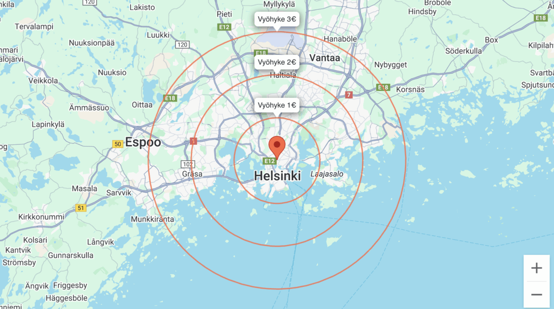 Kartalle on määritelty valmiit hintavyöhykkeet, joiden avulla toiminto tunnistaa, mille vyöhykkeille matka sijoittuu.